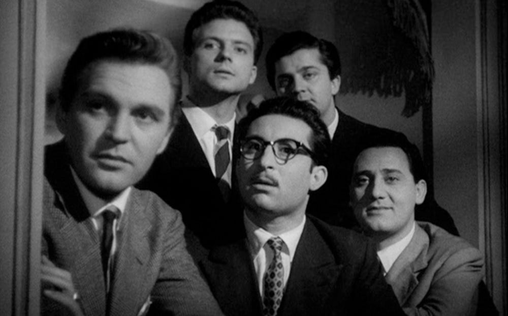 That doesn’t mean that either one is better or worse than the other. While 8 1/2 is looking at one main character, this film focuses on a wider group of five friends, Fausto (Franco Fabrizi), Moraldo (Franco Interlenghi), Leopoldo (Leopoldo Trieste), Riccardo (Riccardo Fellini), and Alberto (Alberto Sordi). The story does zoom in a bit more on Fausto as it goes along, but we get roughly equal attention on the other four.1